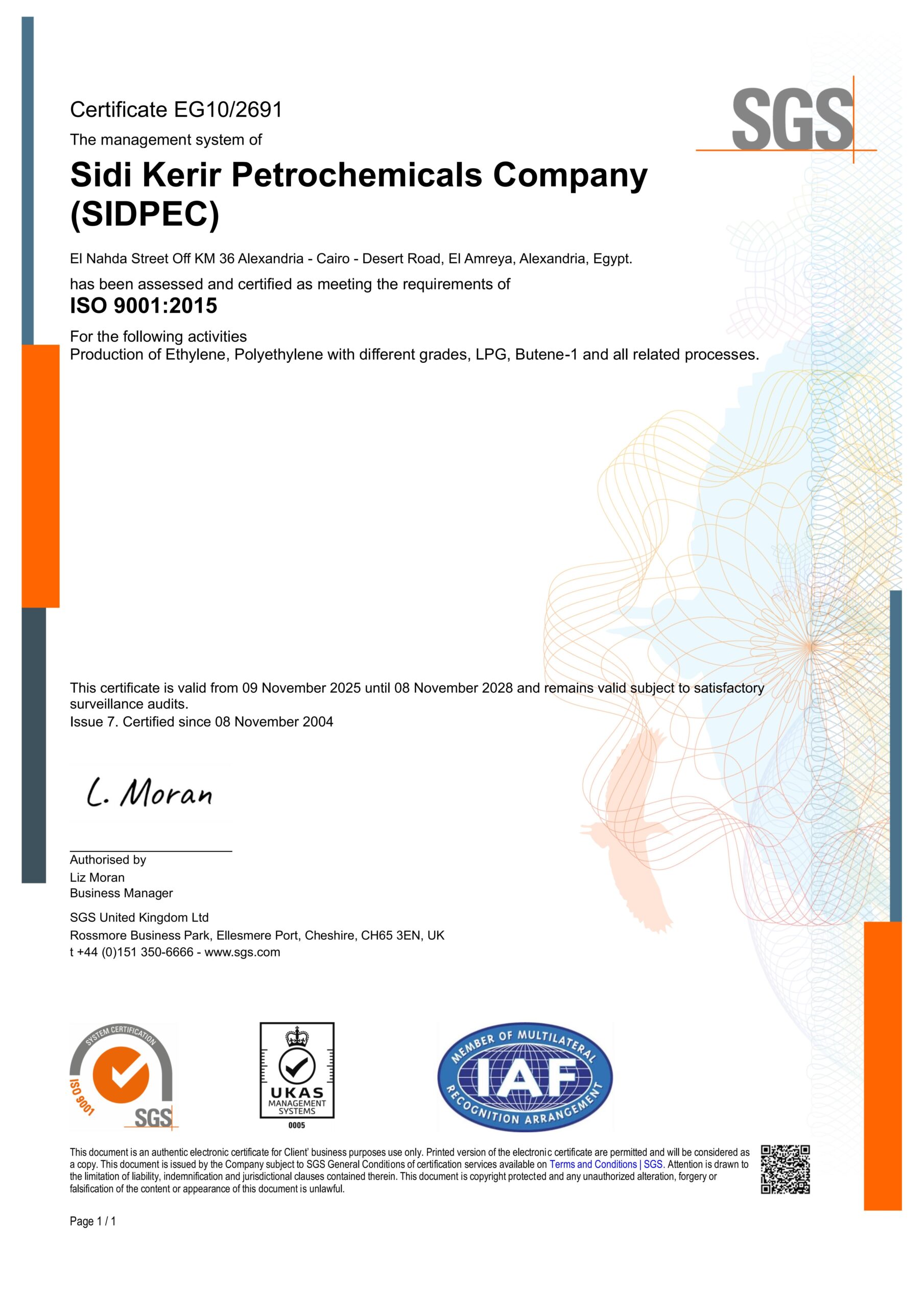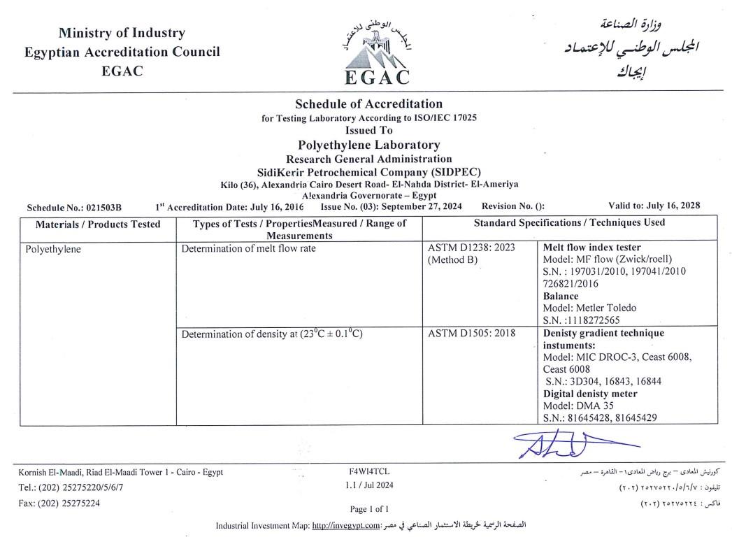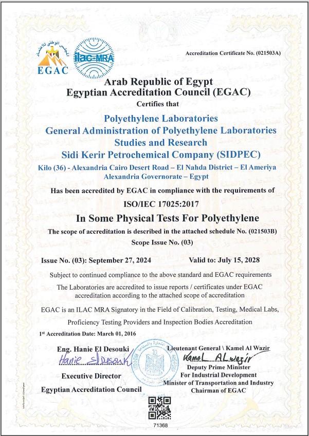 The fruitful cooperation of SIDPEC various departments aims to improve the properties of the final product and to maintain the required level of quality to ensure continued competition in the market.Moreover, Polyethylene laboratories cooperate with academic institutes to improve scientific research in the field of polymers. The lab has been accredited by Egyptian Accreditation Council (EGAC) in compliance with the requirement of ISO /IEC 17025:2005, in the field of some physical tests for Resins.15 certificate renewal as the first company of petrochemical sector that achieves this transition in a record time with its well qualified team and the power of commitment of the top management.