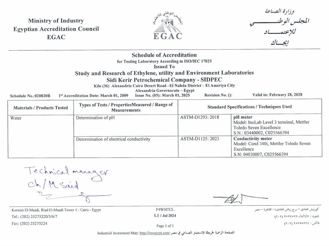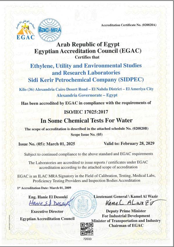 The lab has been accredited by Egyptian Accreditation Council (EGAC) in compliance with the requirement of ISO /IEC 17025:2005, in the field of some chemical testing of water.