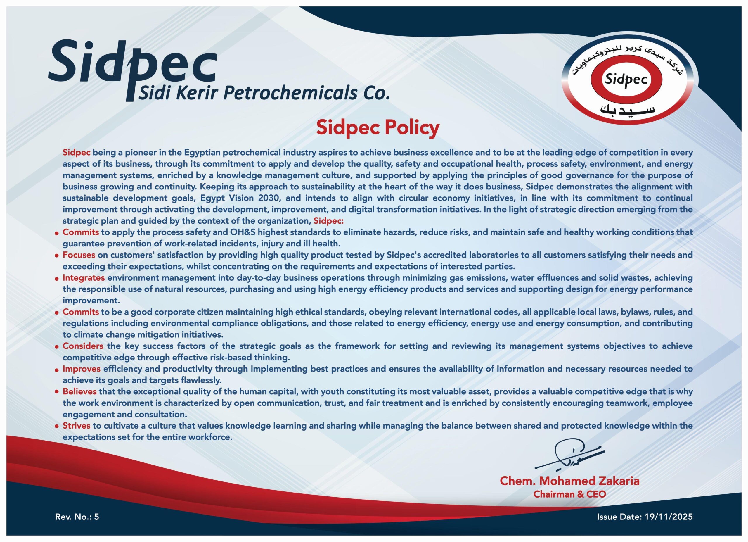 At Sidpec, leadership is defined by stewardship. We are committed to a “Zero-Harm” philosophy, integrating ISO-certified safety protocols with a bold Decarbonization Roadmap to ensure that Egypt’s industrial growth remains sustainable for generations to come.
